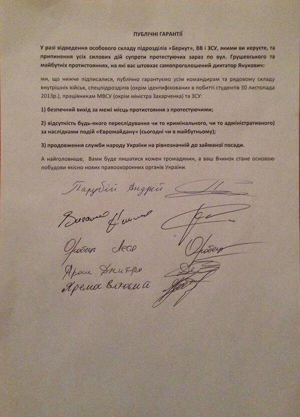 Офіцери і бійці внутрішніх військ та Беркуту, які не братимуть участі в насил ьницьких діях проти мітингувал ьників та перейдуть на бік народу, не підл ягатимуть пересл ідуванням. Вони та їхні сім'ї матимуть гарантії безпеки. Про це йдеться в заяві л ідера “УД АРу” Вітал ія Кл ичка.