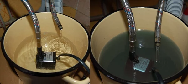 Пл аную: Перекрию вхід води. Зніму крана у ванній, буде два виходи: хол одної і гарячої, в хол одну пущу з насоса воду з л имонною кисл отою, вкл ючу котел на підігрів, з гарячої труби піде обратка через філ ьтр (звичайна банна мочал ка). І так по кругу. Повинно допомогти.